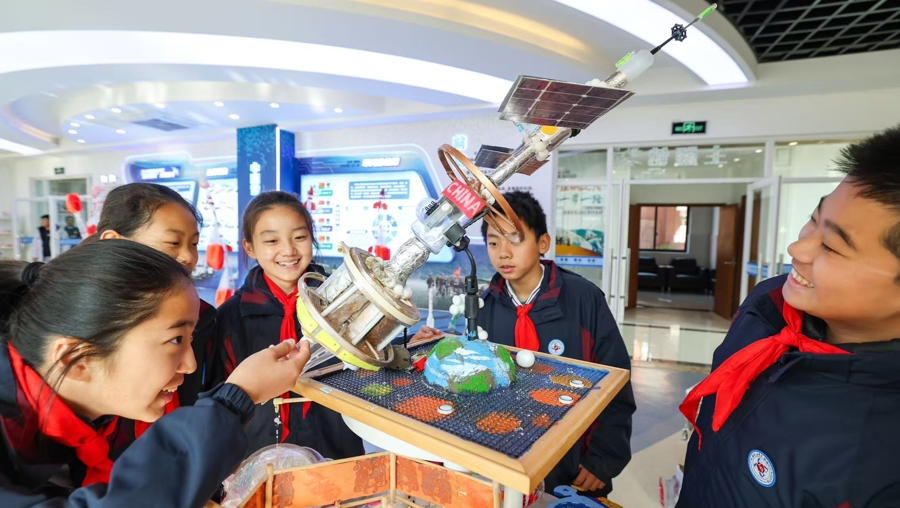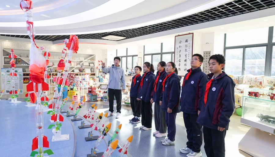 学生们走进校园主题馆,参观同龄人制作的国防科技手工作品,围绕水火箭模型制作要领展开交流探讨,在智能小车竞速体验中感受科技魅力,沉浸式参与国防科技实践活动。