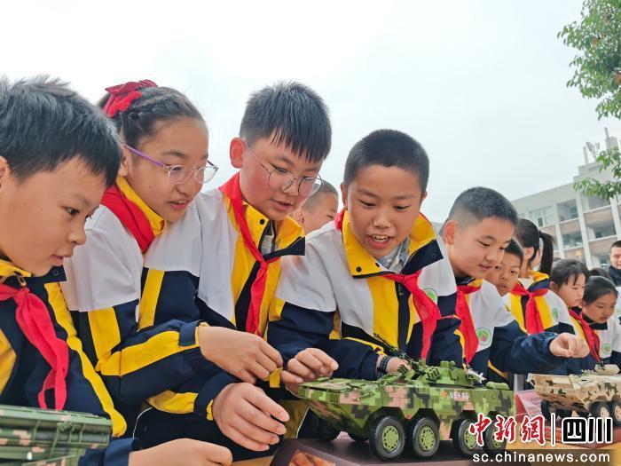 现场最引人注目的环节莫过于武器装备模型展示。西充县人武部、县国动办的工作人员携带国产武器装备模型及国防科普展板走进校园,为师生们带来一场“零距离”的国防科普盛宴。“我们国家的武器装备既好看,也好先进啊!长大后我也要参军保家卫国。”一位小学生激动地表示。