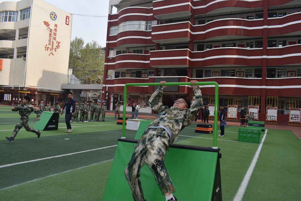 “前方障碍区,快速通过!”4月2日上午9时许,随着教官一声令下,洛阳市安徽路小学的操场上顿时沸腾起来。身着迷彩服的学生们如小老虎般冲进军事障碍赛道,低姿匍匐、翻越矮墙……汗水顺着脸颊滑落,却没有一个孩子放慢脚步。