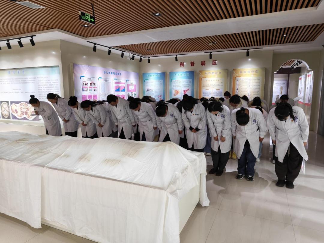 随后,全体师生有序步入人体生命科学馆,在留言板前写下感恩寄语与学医誓言,以真挚文字表达对无言良师的敬意。在“大体老师”标本室,全体师生脱帽肃立,进行鞠躬默哀,以最庄重的礼仪向大体老师表达深深的感恩与致敬。现场气氛肃穆,每一次鞠躬都饱含敬意,生命与奉献的意义在师生心中愈发深刻。
