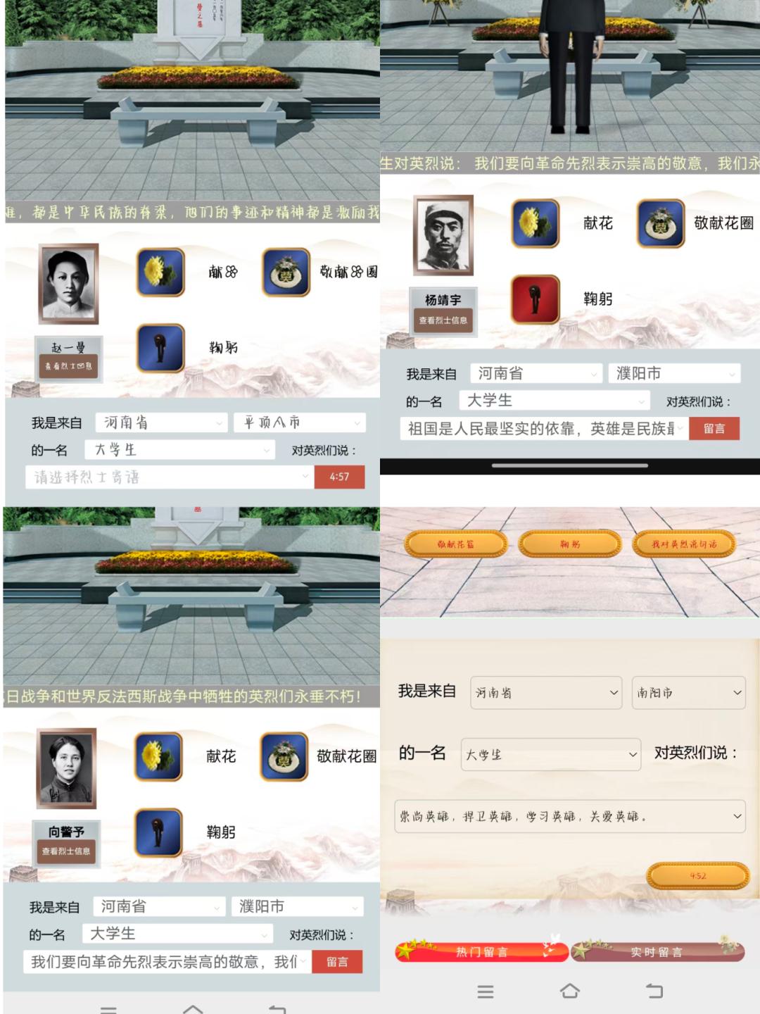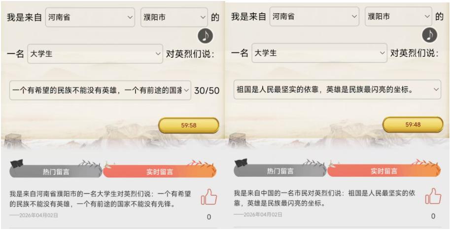 在网上祭奠英烈活动中,学院依托网络文明祭奠平台,组织师生开展“云端寄哀思、线上祭英烈”活动。师生们通过线上献花、鞠躬、撰写缅怀寄语等方式,向为国家独立、民族解放、人民幸福英勇献身的革命先烈致以崇高敬意与深切哀思。大家在留言中写下对英烈的缅怀之情、对家国的赤诚之心,深刻感悟革命先烈不畏牺牲、保家卫国的英雄气概,进一步增强了国防意识与爱国情怀。