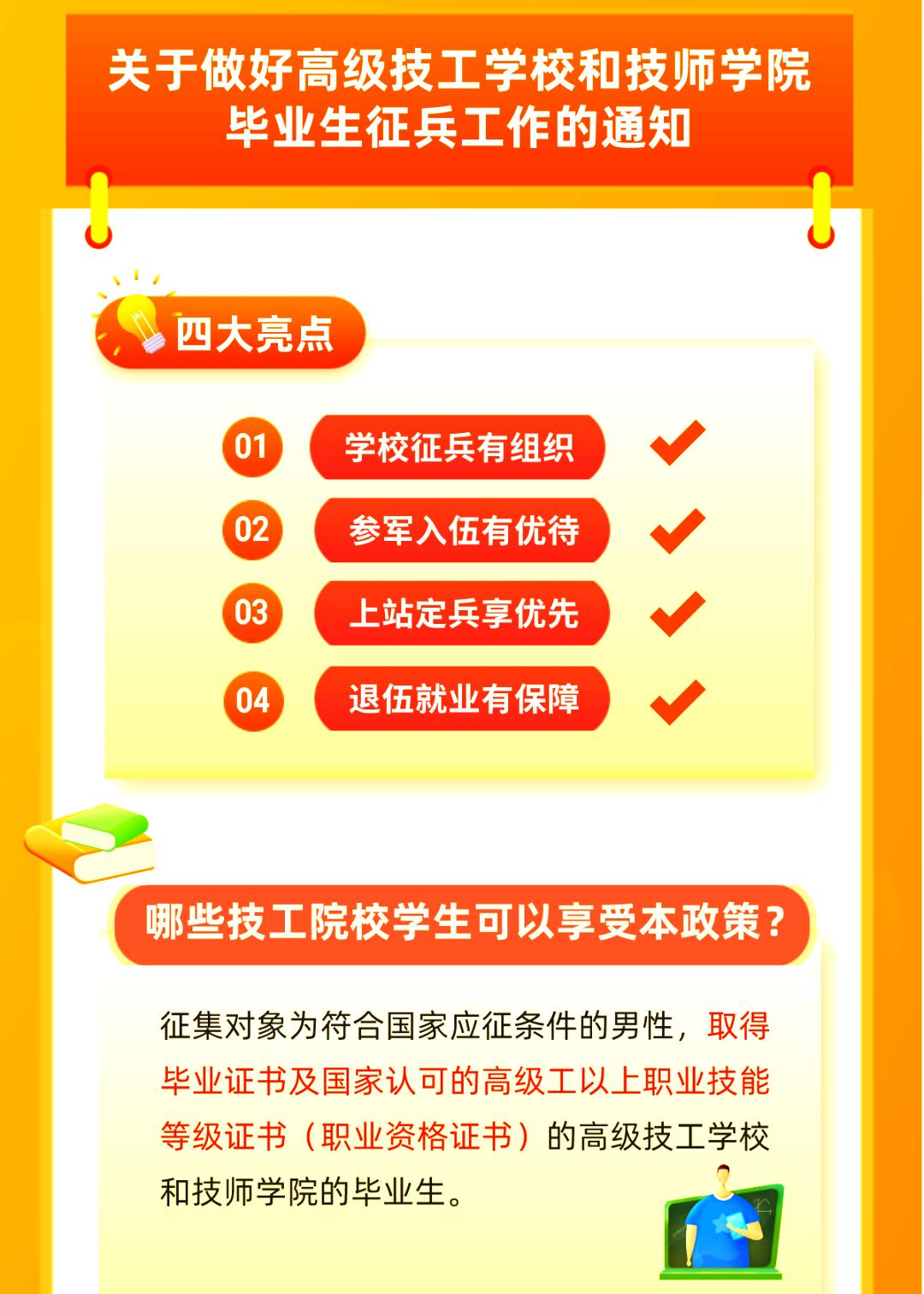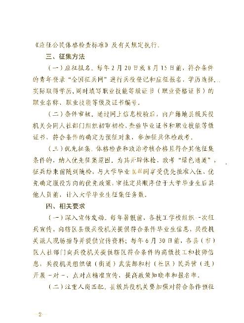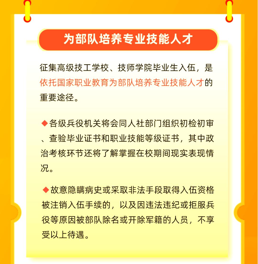 鼓励更多高级技工学校高级工班和技师学院高级工班、预备技师班(统称为高级技工院校)的毕业生加入军队,以此优化兵员征集的结构,为部队注入更多具备高素质技术技能的人才。同时,我们也明确了征集对象的范围和条件。