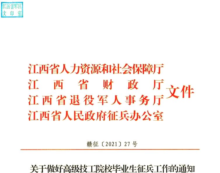 近日,江西省人力资源社会保障厅、省财政厅、省退役军人事务厅以及省人民政府征兵办公室共同发布了《关于做好高级技工院校毕业生征兵工作的通知》。